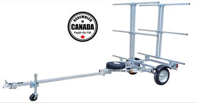 Galvanized welded steel frame construction with retractable tongue and bumpers for vertical storage indoors or out. Ships fully assembled. Comes equipped with a pair of adjustable 64" heavy steel crossbars with tie down eye bolts attached to 29.5" centre masts as well as a set of 78" crossbars on 4" risers for safely transporting canoes and heavier fishing kayaks.